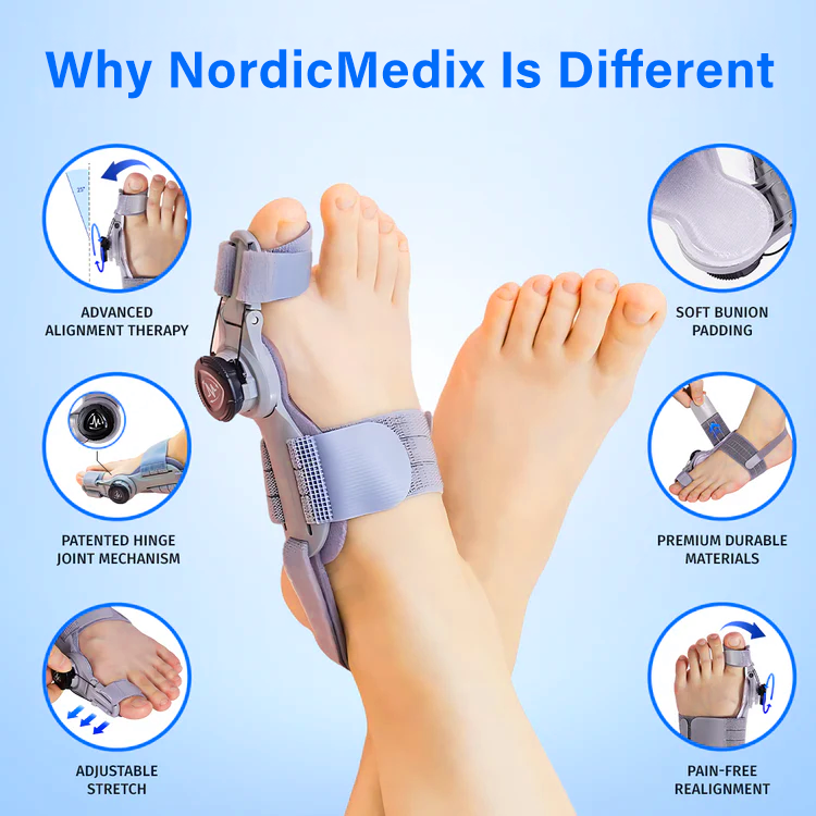 The NordicMedix Bunion Fix administers advanced alignment therapy. It's designed to support the realignment of the big toe and gradually alleviate inflammation by using a powerful patented hinge joint mechanism.